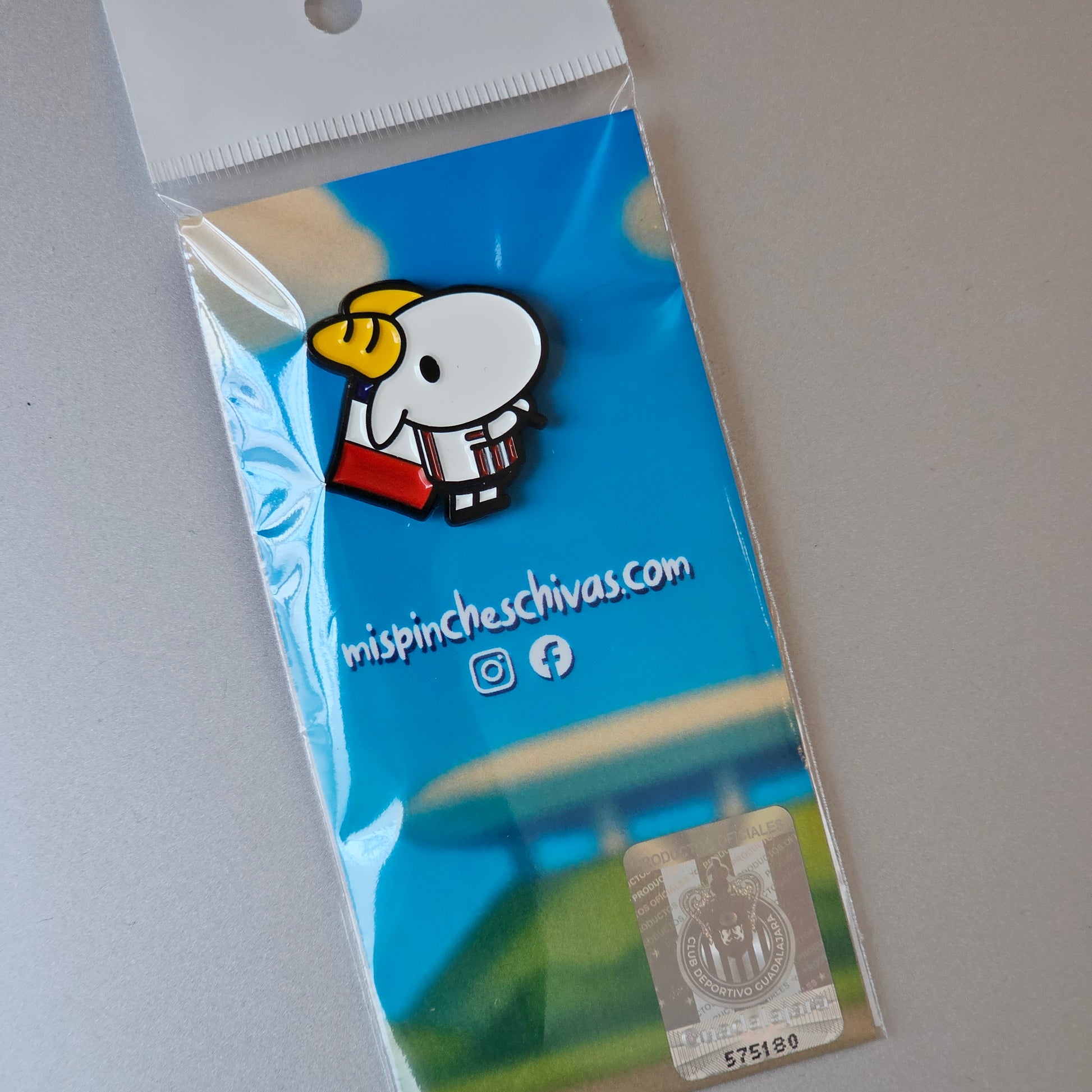Este pin metálico de 2.5 cm presenta un diseño original de Mispincheschivas, con un personaje que sostiene una bandera. Perfecto para mostrar tu apoyo al Rebaño Sagrado en el estadio, combina durabilidad y estilo en un accesorio compacto y representativo.